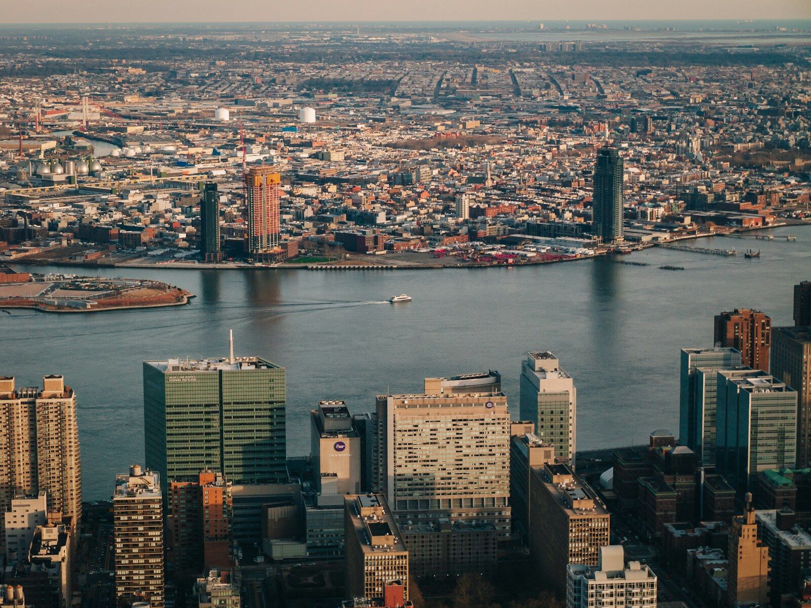 an aerial view of a city with a river running through it